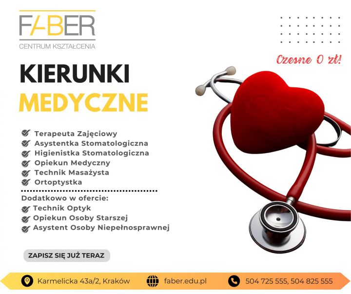 Faber Centrum Kształcenia zaprasza do zapisów na kierunki medyczne. Nie mamy czesnego, a zajęcia się odbywają w weekendy lub w piątki po południu oraz w weekendy. Nauka na wybranych kierunkach trwa tylko 1 rok! Start zajęć już w lutym 2026!