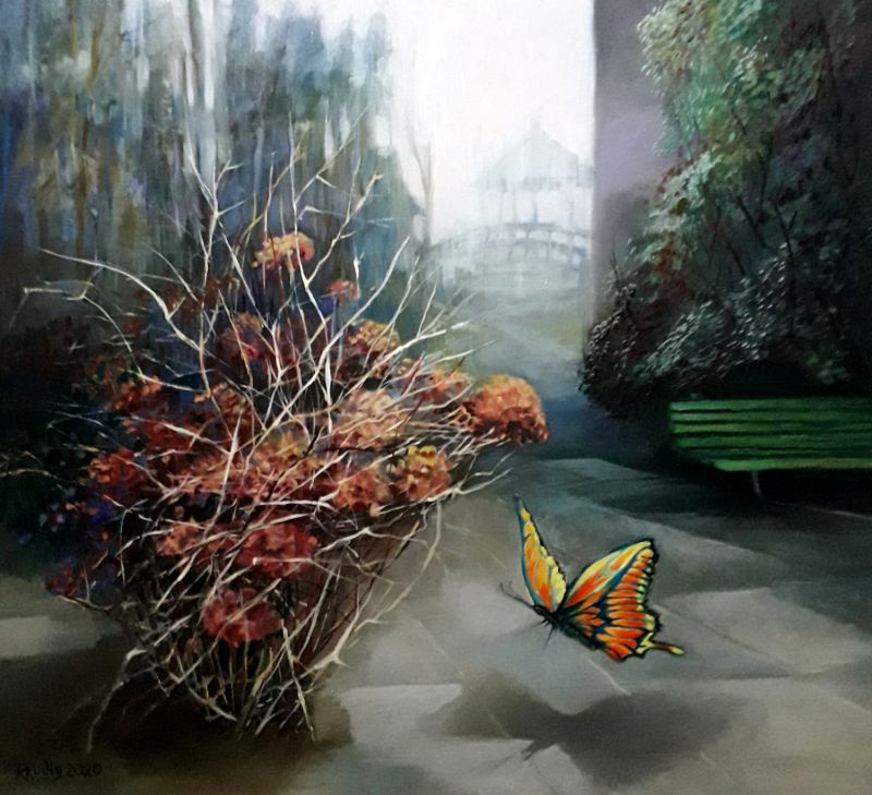 We czwartek w Teatrze Stygmator odbył się spektakl poetycko- muzyczny pod tytułem ,,Przemijanie" , prowadzony przez Violettę Zygmunt , a iustrowany między innymi moimi obrazami. Obraz pod tytułem,, Podróż "namalowałam 37 lat temu. Wtedy własnie w młodości, czułam potrzebę malowania przemijania ludzkiego życia, urody i starości. Na obrazie w przedziale pociągu siedzę ja - młoda i jem jabłko, a na przeciwko wyobrazenie mnie starej( czy będe tak wygladałą?) i czy dotrwam? Za oknem podróż i szybko mijający czas. Podróż to symbol i synonim życia.( zdjęcie jest złe, z lampą błyskową, bo takie to były czasy)Refleksja była, nie tylko w jednym obrazie, a w całej serii, ale zdjęcia obrazów z tych lat nie zachowały się, albo bardzo złe. Obraz drugi nosi tytuł,,Gdy ogród śpi" z 2020 roku. Spi w zimie, by z wiosną się odrodzić, a motyl... ten żyje krótko ale pięknie, O jego symbolice przepięknie mówiła Pani Violetta, kto słyszał, ten wie.