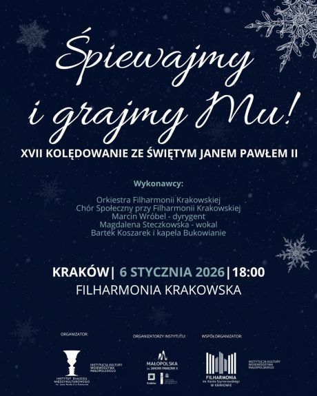 Instytut Dialogu Międzykulturowego i Filharmonia im. Karola Szymanowskiego w Krakowie zapraszają na wyjątkowe wydarzenie — XVII Kolędowanie ze świętym Janem Pawłem II. Śpiewajmy i grajmy Mu!