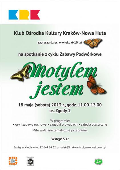 Zapraszamy dzieci w wieku 6-10 lat na kolejne spotkanie z cyklu Zabawy podwrkowe organizowane przez Klub Orodka Kultury Krakw-Nowa Huta (os. Zgody 1), ktre odbdzie si 18 maja o godz. 11.00.