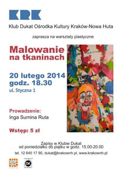 Zapraszamy mieszkacw Grbaowa na warsztaty plastyczne powicone technikom malowania na tkaninach, ktre organizuje Klub Dukat Orodka Kultury Krakw-Nowa Huta (ul. Styczna 1).