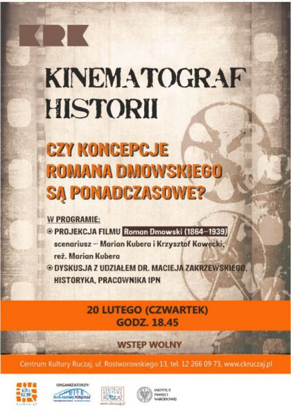 Zapraszamy na kolejne spotkanie z cyklu Kinematograf Historii. W programie: projekcja filmu "Roman Dmowski 1864-1939" (scenariusz: Marian Kubera i Krzysztof Kawcki, reyseria: Marian Kubera) oraz dyskusja z udziaem dr. Macieja Zakrzewskiego, historyka i pracownika IPN.