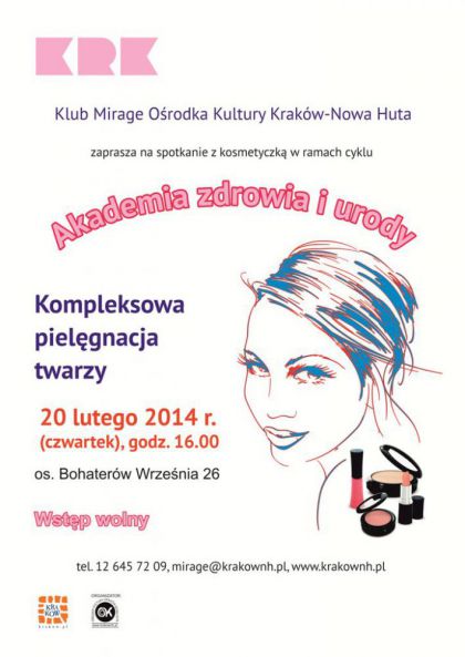 Kolejne spotkanie dla Pa z konsultantkami kosmetycznymi w ramach cyklu Akademia Zdrowia i Urody, organizowanego przez Klub Mirage Orodka Kultury Krakw-Nowa Huta. Tym razem uczestniczki spotkania dowiedz si, jakie zabiegi naley stosowa w codziennej pielgnacji, aby zachowa pikny i zdrowy wygld skry. Ponadto przewidziano prezentacj zabiegw na twarz, a take porady indywidualne oraz kiermasz kosmetykw.