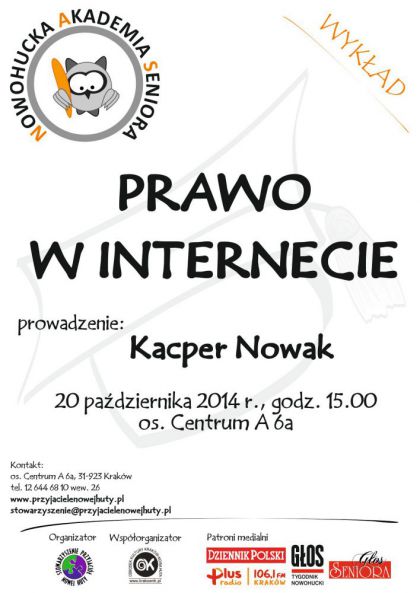 Kolejny wykad w ramach Nowohuckiej Akademii Seniora powicony bdzie prawnym aspektom korzystania z Internetu. Spotkanie poprowadzi Kacper Nowak.