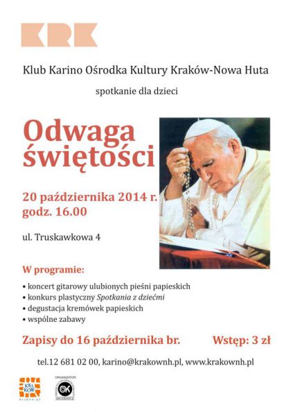 Klub Karino Orodka Kultury Krakw-Nowa Huta (ul. Truskawkowa 4) zaprasza na spotkanie dla dzieci z okazji obchodw Dnia Papieskiego.