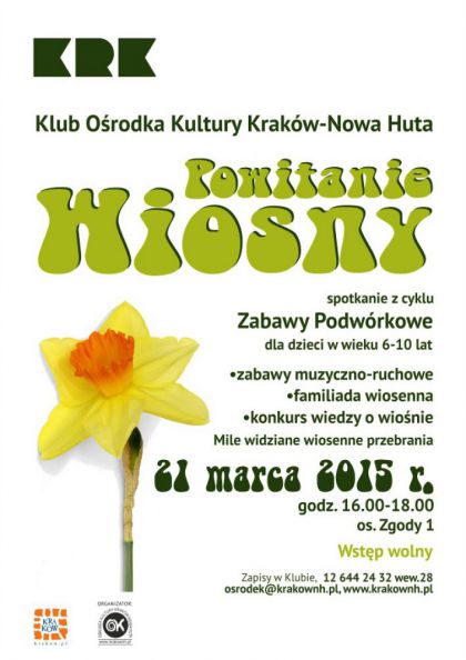 Klub Orodka Kultury Krakw-Nowa Huta (os. Zgody 1) zaprasza na spotkanie z cyklu Zabawy podwrkowe, ktrego celem jest wsplne mie spdzenie wolnego czasu w sobotnie popoudnie, ksztatowanie wraliwoci estetycznej, poczucia pikna przyrody oraz zaangaowanie dzieci do udziau w konkursach i zabawach muzyczno-ruchowych zwizanych z nadchodzc wiosn. 21 marca dzieci wezm udzia w konkursie plastycznym, odpowiedz na pytania w konkursie doty(...)  ... więcej »