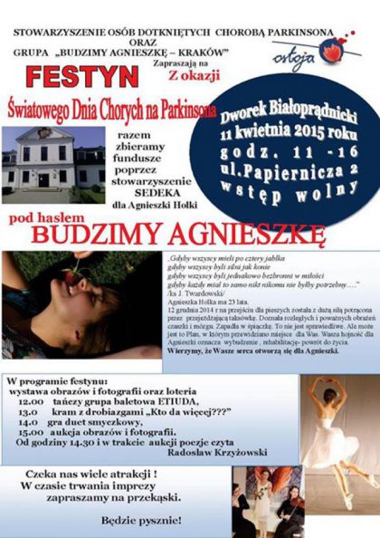 Stowarzyszenie Osb Dotknitych Chorob Parkinsona Ostoja oraz Grupa Budzimy Agnieszk Krakw, zapraszaj na festyn z okazji wiatowego Dnia Chorych na Parkinsona pod hasem Budzimy Agnieszk. W sobot (11 kwietnia) w godzinach od 11:00 do 16:00 w Zajedzie Kociuszkowskim, bdzie czeka na Pastwa wiele atrakcji, dziki ktrym wsplnie pomoemy Agnieszce Holce. Wstp wolny.
