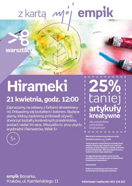 Zapraszamy na zabawy z farbami akwarelowymi. Pobawimy si ksztatem i kolorem. Rozlane plamy, kleksy, bdziemy prbowali oywi, stworzy ksztaty konkretnych przedmiotw, postaci, nada im sens. Wszystko to przy uyciu wyobrani i flamastrw. Wiek: 5+. Zapisy pod nr. 603 114 165(...)  ... więcej »