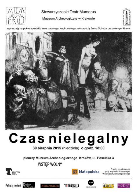 Tytu spektaklu "Czas nielegalny" nawizuje do preambuy opowiadania Bruno Schulza "Genialna epoka". W oparciu o twrczo Schulza dla widzw zostaa przygotowana imaginacyjno-teatralna ekspedycja w boczne odnogi czasu, troch nielegalne co prawda i problematyczne, jakby to powiedzia sam autor Sklepw cynamonowych. A gdzie bardziej ni w muzeum, szczeglnie tym gromadzcym zabytki archeologiczne, czas moe by poddawany manipulacjom? Podczas teatralnej wdrwki, dziki wsppracy z Muzeum Archeologicznym w Krakowie, widzowie bd mieli moliwo zobaczy niedostpne na co dzie dla zwiedzajcych zauki gmachu, w ktrych oyj bohaterowie grafik i opowiada schulzowskich. Drugim, wanym tematem spektaklu bd nawizania do kina niemego do filmw, ktre oglda Schulz. Poczenie rodkw wyrazu kina niemego i teatru pozwoli na nastanie czasu nielegalnego. Choby przez t godzin, w cigu ktrej trwa bdzie spektakl-wdrwka.