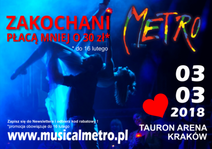 Z okazji zbliajcych si Walentynek dla osb, ktre si zapisz do newslettera na www.musicalmetro.pl, organizator przygotowa specjalny kod rabatowy: