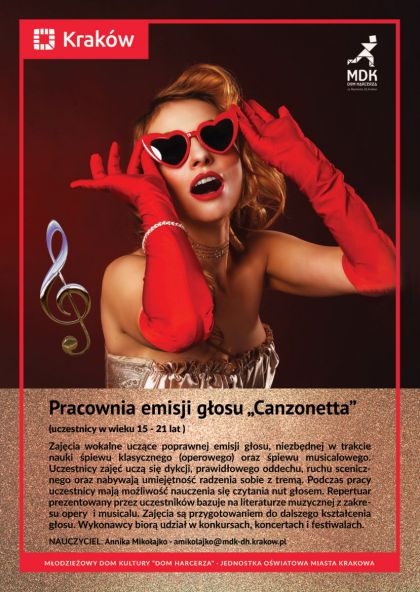 Pracownia Emisji Głosu "Canzonetta" to zajęcia przeznaczone dla młodzieży między 15 a 21 rokiem życia. Są to zajęcia poprawnej emisji, które mogą być wstępem do nauki śpiewu musicalowego i operowego, a także mogą pomóc przygotować się do egzaminów do szkół muzycznych i szkół wokalno-aktorskich. Na zajęciach uczymy się poprawnej emisji głosu, niezbędnej w trakcie nauki śpiewu klasycznego (operowego) oraz śpiewu musicalowego. Uczestnicy zajęć uczą się dykcji, prawidłowego oddechu, ruchu scenicznego oraz nabywają umiejętności radzenia sobie z tremą. Repertuar prezentowany przez uczestników bazuje na literaturze muzycznej z zakresu opery i musicalu. Główny nacisk położony jest na śpiew solowy i śpiew wielogłosowy.