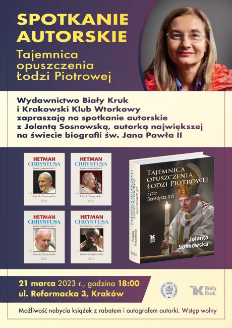 Wydawnictwo Biały Kruk i Krakowski Klub Wtorkowy mają zaszczyt zaprosić na spotkanie autorskie z Jolantą Sosnowską, autorką największej na świecie biografii św. Jana Pawła II oraz pierwszej polskiej biografii Benedykta XVI. Wieczór autorski odbędzie się 21 marca o godz. 18.00 w Krakowskim Klubie Wtorkowym przy ul. Reformackiej 3.