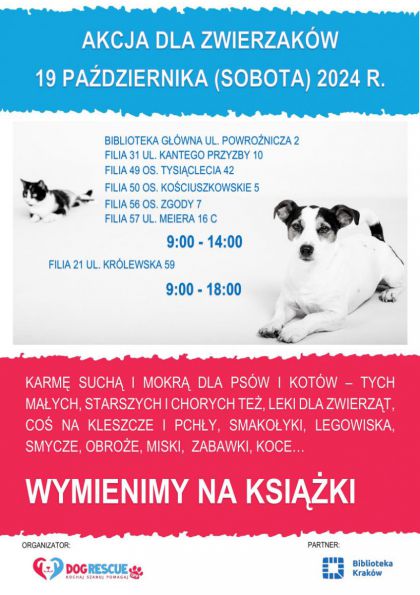 19 października 2024 możesz zrobić coś dobrego dla bezdomnych psów i kotów pod opieką Dog Rescue. W kilku filiach Biblioteki Kraków będzie trwać akcja „Książka za karmę” 🙂