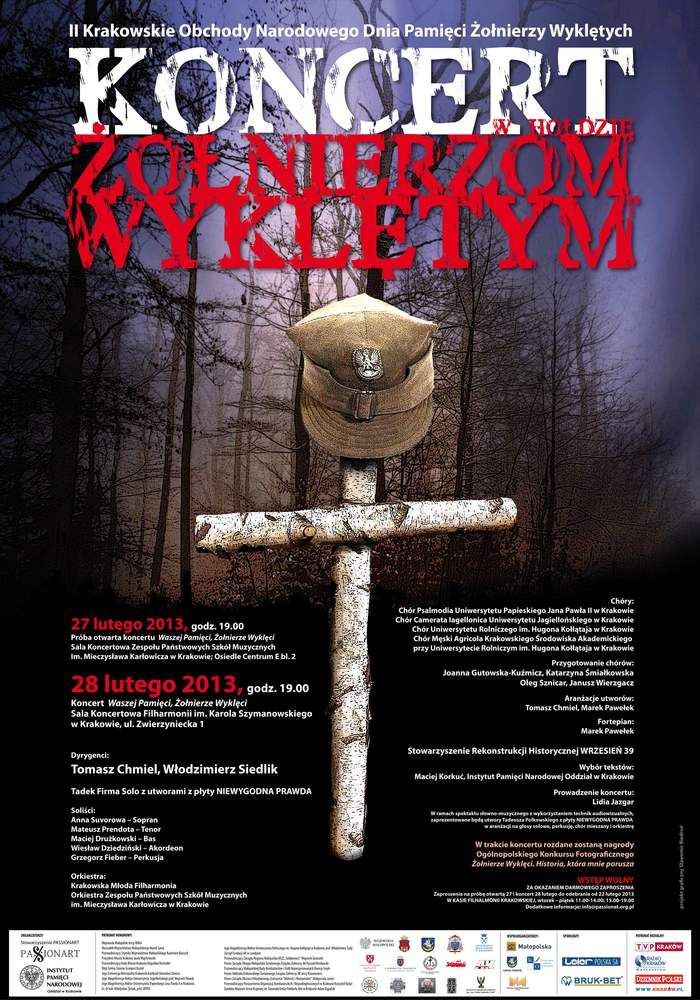 Oddział Instytutu Pamięci Narodowej oraz Stowarzyszenie PASSIONART pragnšc oddać hołd bohaterom oraz przybliżyć sylwetki Żołnierzy Wyklętych młodemu pokoleniu, już po raz drugi zapraszajš na koncert w ramach Krakowskich Obchodów Narodowego Dnia Pamięci Żołnierzy Wyklętych. Zrealizowane w zeszłym roku z wielkim rozmachem przedsięwzięcie zgromadziło w Filharmonii im. Karola Szymanowskiego w Krakowie ponad tysišc osób widzów i artystów.