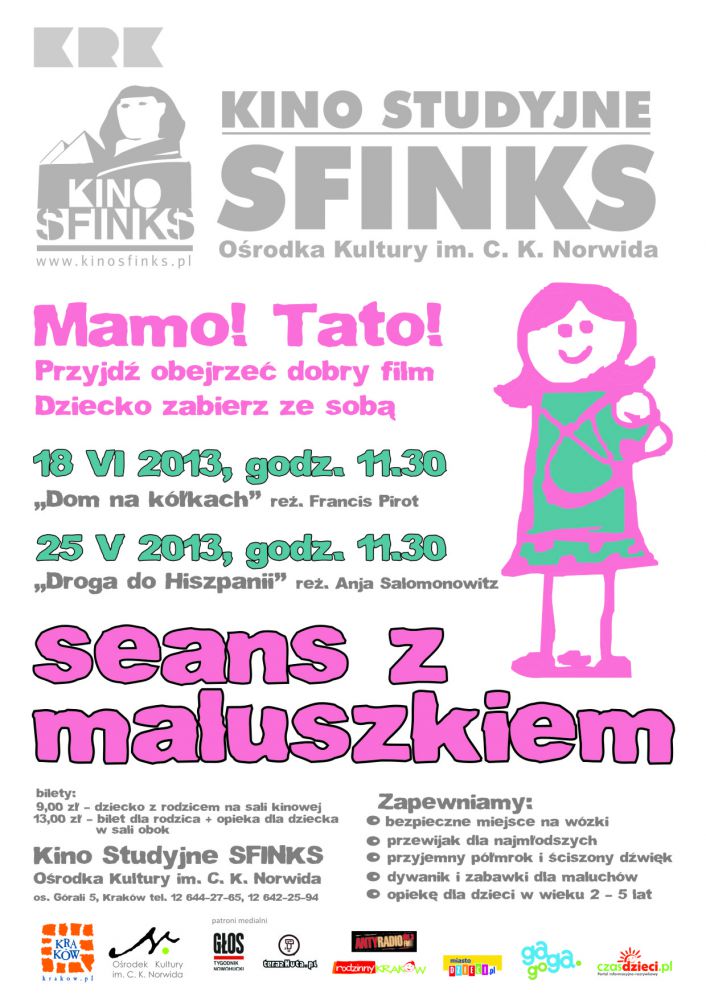 Podczas cyklu SEANS Z MALUSZKIEM proponujemy wspólne, dopołudniowe projekcje dobrych filmów, na które zapraszamy rodziców wraz z dziećmi gwarantujšc szczególnie dobrany repertuar (kino o wysokich walorach zdjęciowych i muzycznych, bez scen przemocy), opiekę dla dzieci w wieku 2-4 lat, zaplecze organizacyjne przyjazne rodzicom (przewijak dla najmłodszych, bezpieczne miejsce na wózki) a także przyjemny półmrok na sali kinowej i ciszony dwięk dla tych rodziców, którzy zechcš oglšdnšć film w towarzystwie swojej pociechy. Spotkania odbywajš się w Kinie Sfinks dwa razy w miesišcu, w godzinach dopołudniowych.