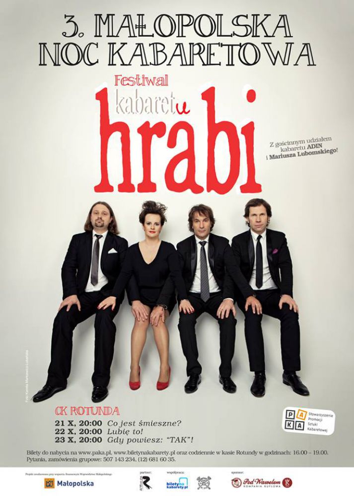 Szanowni Państwo, serdecznie zapraszamy na Krakowski Festiwal Kabaretu Hrabi w ramach III Małopolskiej Nocy Kabaretowej, który odbędzie się w dniach 21-23 padziernika 2013r.