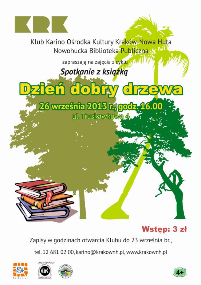 Klub Karino Orodka Kultury Krakw-Nowa Huta (ul. Truskawkowa 4) i Nowohucka Biblioteka Publiczna zapraszaj na zajcia literacko-przyrodnicze z cyklu Spotkanie z ksik. Spotkanie odbdzie si 26 wrzenia o godz. 16.00. Zajcia przeznaczone s dla dzieci modszych, przygotowano wiele gier i zabaw edukacyjnych dla uczestnikw spotkania. Zapisy (tel. 12 681 02 00).