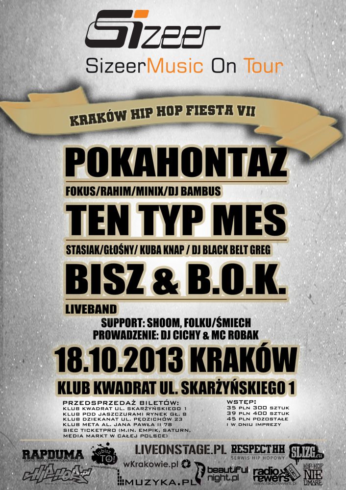 Podczas krakowskiej odsłony trasy, 18 paŸdziernika w klubie Kwadrat, jakš będzie już siódma edycja niezwykle popularnej Hip Hop Fiesty, swojš nowš płytę promować będzie Ten Typ Mes przy wsparciu jednego z Lepszych Żbików – Kuby Knapa, Stasiaka, Dj’a Black Belt Graga i Głoœnego. Po raz pierwszy na Fieœcie zagoszczš natomiast Bisz & B.O.K. Liveband. Raper zagra z całym B.O.K Livebandem materiał z ubiegłorocznego albumu pt. „Wilk Chodnikowy”, który wepchnšł reprezentanta Bydgoszczy na najwyższe stopnie polskiej sceny rapowej. Będš więc hip hopowe rymy, a do tego dodajšce emocjonalnoœci skrzypce, pozwalajšce na konkretniejszš zabawę cięższe gitarowe riffy, wprowadzajšca wszystkich w odpowiedni rytm perkusja oraz grane z MPC sample i popisy didżejskie.