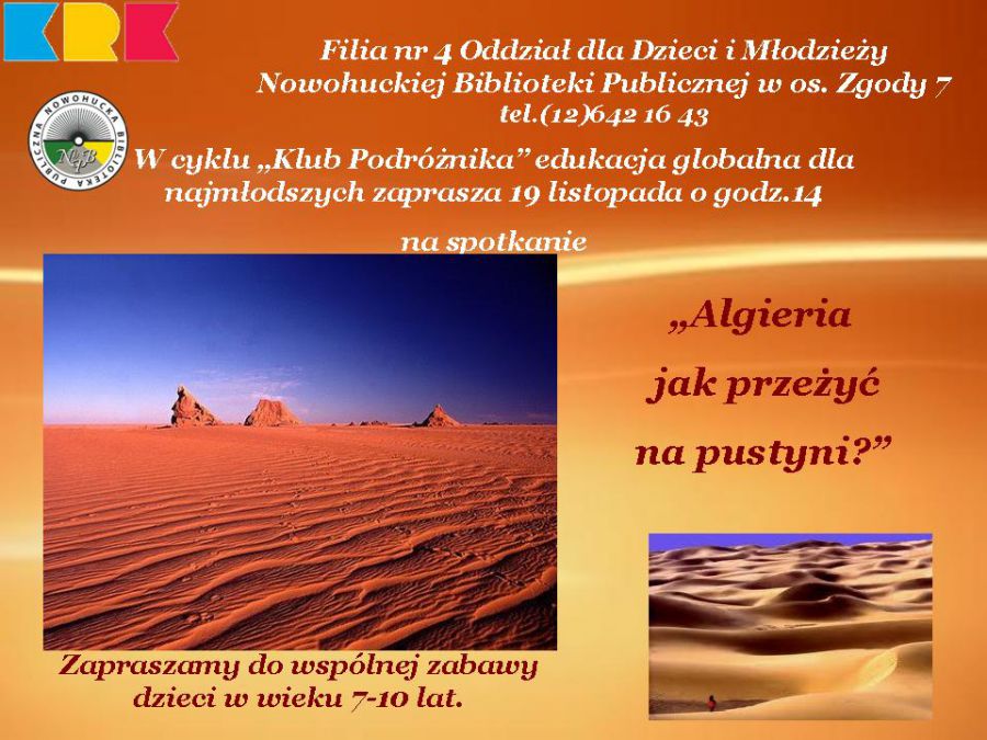 Algieria jak przeżyć na pustyni? to kolejne spotkanie dla dzieci w cyklu Klub Podróżnika edukacja globalna dla najmłodszych. Uczestnicy warsztatów poznajš Algierię największe państwo w Afryce północnej, położone nad Morzem ródziemnym. Poznajš klimat państwa, jego wpływ na życie mieszkańców, charakterystyczne miejsca, zabytki. Odbędš również podróż po największej goršcej pustyni na Ziemi Saharze, która rozcišga się na długoci 5700 kilometrów. Dzieci dowiedzš się, w jaki sposób zwierzęta i roliny przystosowane sš do panujšcych warunków, a także poznajš charakterystyczne gatunki występujšce w tej strefie klimatycznej. Jeżeli kto chce zwiedzić ten egzotyczny kraj, to zapraszamy do Biblioteki, by wybrać się w dalekš podróż.