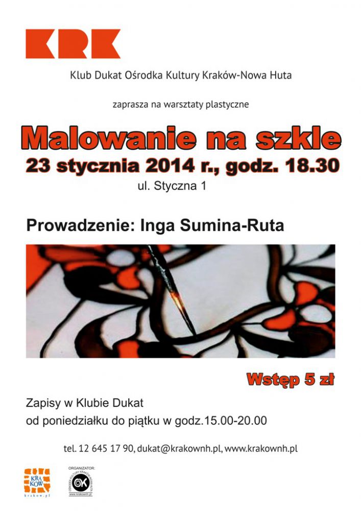 Klub Dukat Oœrodka Kultury Kraków-Nowa Huta (ul. Styczna 1) zaprasza na warsztaty plastyczne poœwięcone technikom malowania na szkle. Zajęcia odbędš się 23 stycznia o godz. 18.30.