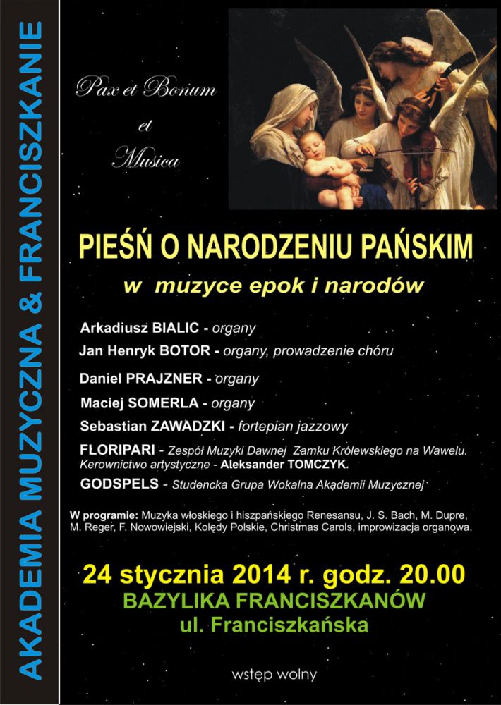 Akademia Muzyczna w Krakowie oraz Franciszkanie z Franciszkańskiej w Krakowie zapraszajš na koncert "Pieœń o Narodzeniu Pańskim w muzyce epok i narodów", który odbędzie się w pištek, 24 stycznia o godzinie 20:00 w Bazylice Franciszkanów w Krakowie. Wstęp na koncert wolny! Serdecznie zapraszamy!