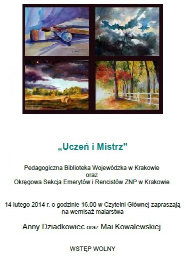 Pedagogiczna Biblioteka Wojewdzka w Krakowie oraz Okrgowa Sekcja Emerytw i Rencistw ZNP w Krakowie zaprasza na wernisa malarstwa Anny Dziadkowiec oraz Mai Kowalewskiej