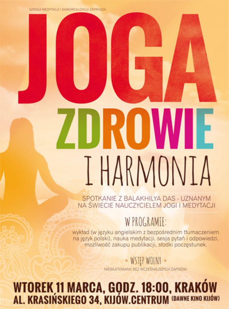 Pełne wyjaœnienie znaczenia jogi i pełne odpowiedzi na te, i podobne pytania uzyskasz w czasie marcowego wykładu doœwiadczonego nauczyciela jogi, eksperta w tej dziedzinie – Balakhilya das. Praktycznie weŸmiesz udział w zajęciach jogi i przekonasz się, że koniecznym w nich atrybutem nie musi być mata oraz, że joga nie zawsze musi być zwišzana z wysiłkiem fizycznym.