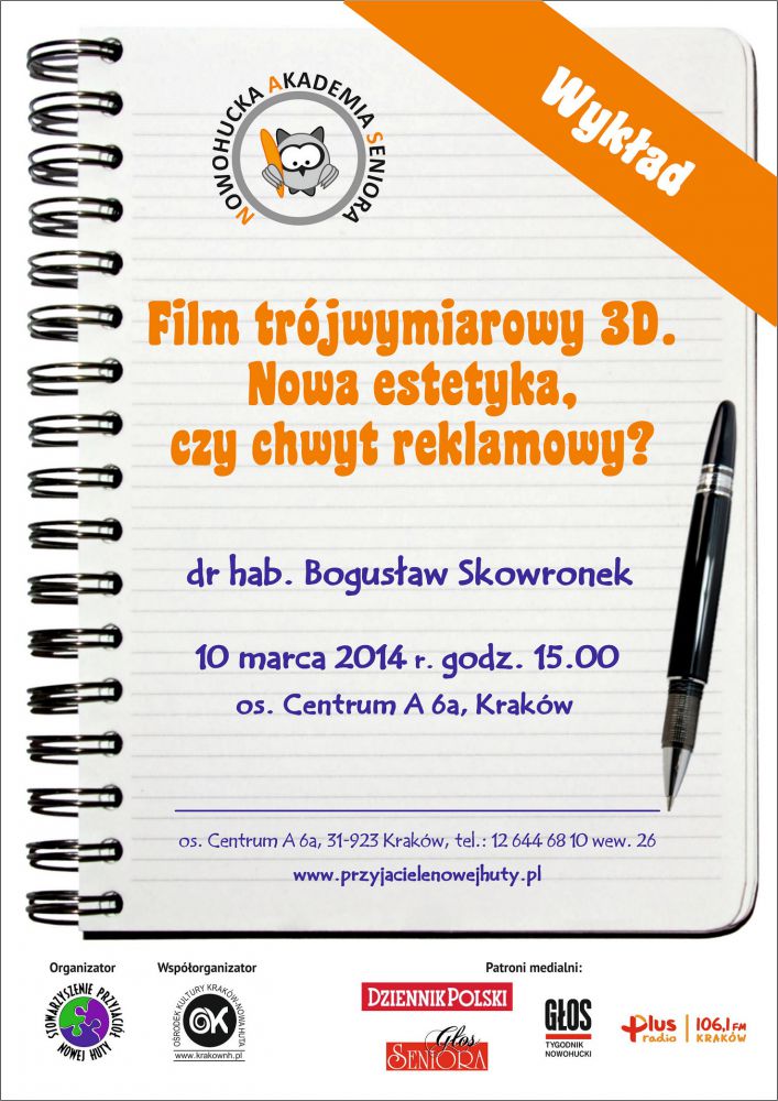 W trakcie prelekcji Kino 3D zostanie rwnie porwnane z tradycyjnym kinem. Dr hab. Bogusaw Skowronek jest profesorem Uniwersytetu Pedagogicznego, filmoznawc, krytykiem i popularyzatorem sztuki filmowej, badaczem wspczesnej kultury audiowizualnej, autorem wielu publikacji naukowych powiconych filmowi, mediom, kulturze popularnej oraz edukacji filmowej.