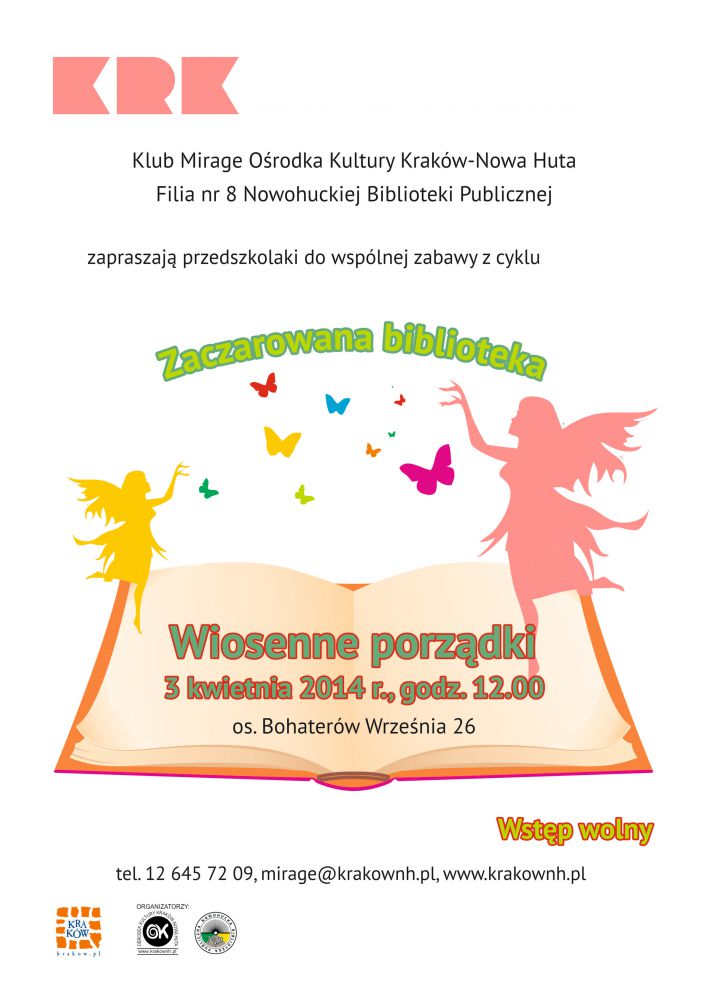 Klub Mirage Oœrodka Kultury Kraków-Nowa Huta (os. Bohaterów Wrzeœnia 26) zaprasza 3 kwietnia o godz. 12.00 na kolejne spotkanie dla przedszkolaków z cyklu Zaczarowana Biblioteka.