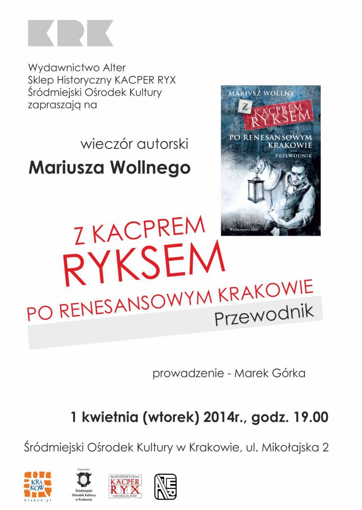Mariusz Wollny; autor ksišżek popularno-naukowych dla dzieci oraz dorosłych, powieci i zwariowanych historii oraz 4-tomowego cyklu o przygodach XVI-wiecznego inwestygatora królewskiego (detektywa) Kacpra Ryksa.