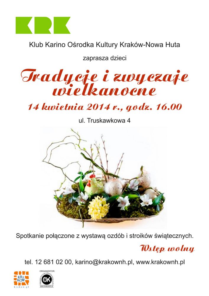 Wielkanoc dzieciom kojarzy się przede wszystkim z palmš, pisankami, œwięceniem pokarmów i lanym poniedziałkiem. Na spotkaniu w Klubie Karino Oœrodka Kultury Kraków-Nowa Huta (ul. Truskawkowa 4). dowiedzš się o innych ciekawych tradycjach i zwyczajach zwišzanych ze Œwiętami, z których wiele praktykowanych jest do dziœ. Zajęcia połšczone będš z wystawš ozdób i stroików œwištecznych.