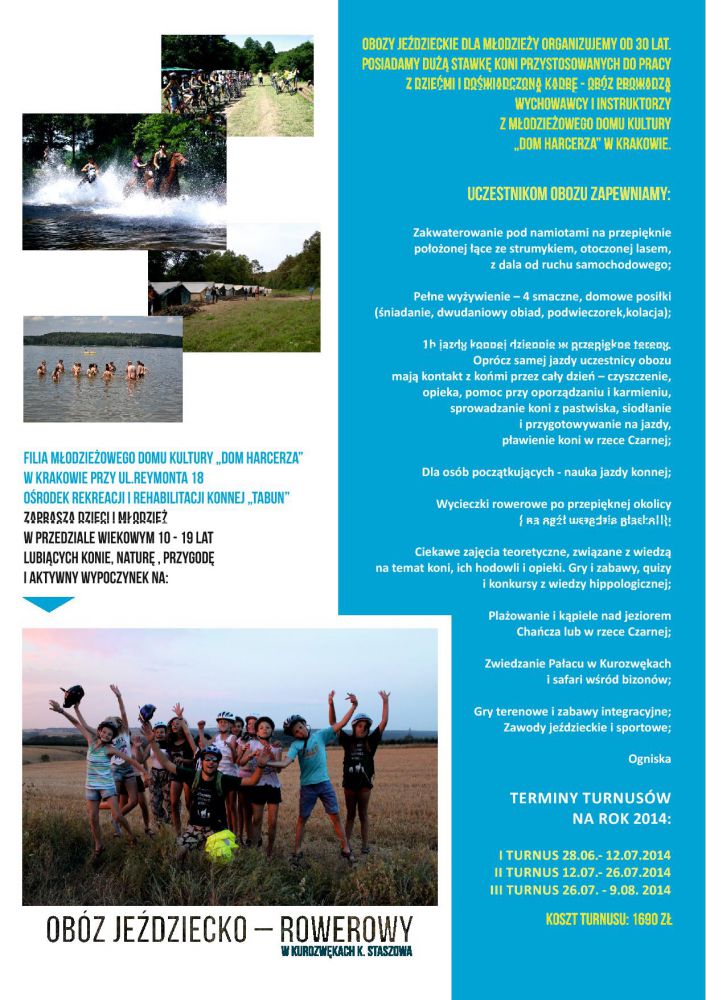 Oœrodek Rekreacji i Rehabilitacji Konnej „Tabun” działajšcy w Młodzieżowym Domu Kultury „Dom Harcerza” już od 28 czerwca zaprasza dzieci i młodzież w wieku od 10-19 lat na obóz jeŸdziecko – rowerowy w Kurozwękach k. Staszowa.