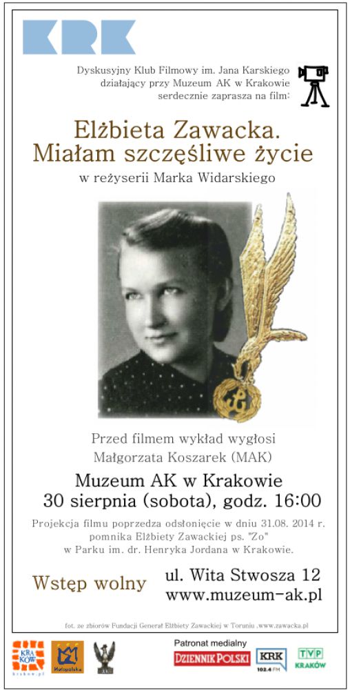 Dyskusyjny Klub Filmowy im. Jana Karskiego zaprasza na pokaz filmu "Elżbieta Zawacka. Miałam szczęliwe życie" w reżyserii Marka Widarskiego, który odbędzie się w sobotę 30 sierpnia o godz. 16:00.