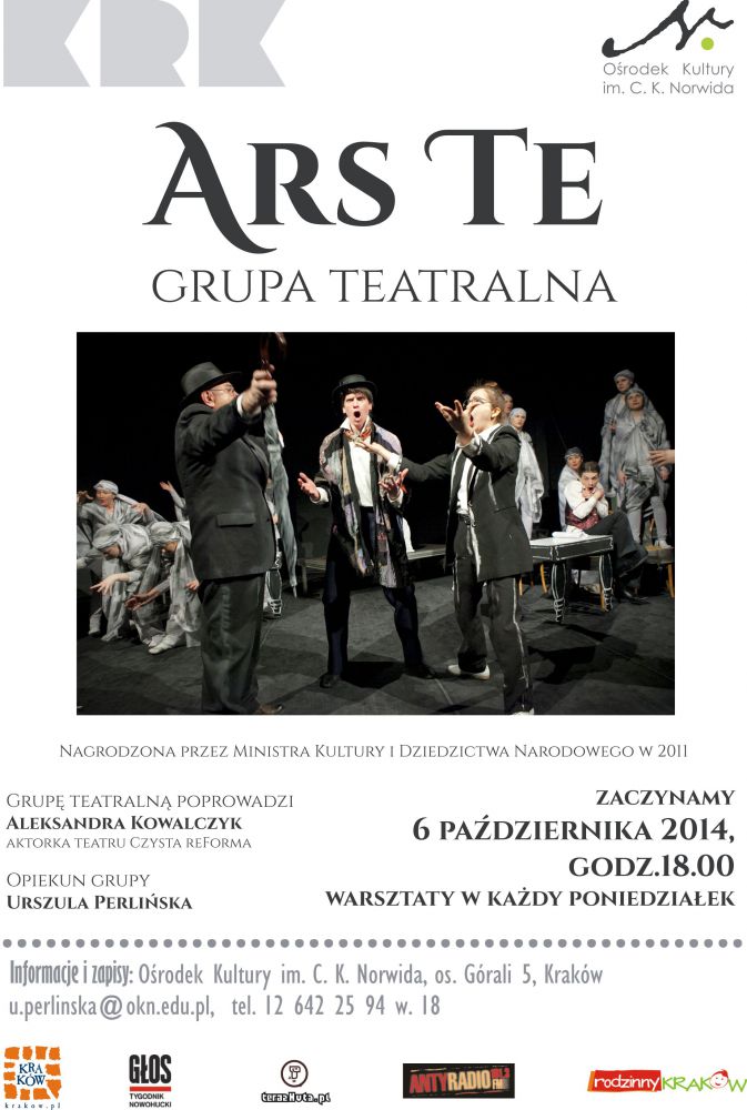 Orodek Kultury im. C.K. Norwida w Krakowie zaprasza na warsztaty teatralne Sceny Ars Te. Pierwsze zajęcia odbędš się już 6 padziernika 2014 r. o godzinie 18:00 na os. Górali 5. Grupa teatralna spotykać się będzie raz w tygodniu w każdy poniedziałek. Warsztaty sš bezpłatne.