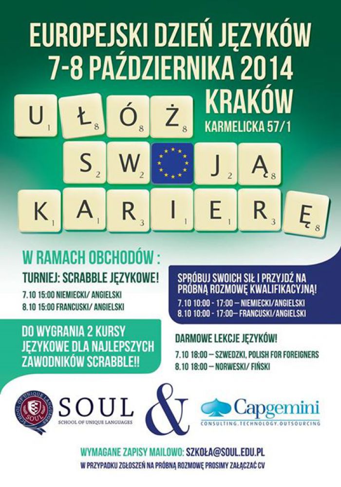 W dniach 7-8 padziernika organizujemy obchody Europejskiego Dnia Języków w Krakowie. W ramach wydarzenia: darmowe lekcje języków obcych (np. szwedzki, norweski, fiński, polish for foreigners), turniej scrabble w 3 językach, poczęstunek przysmaków skandynawskich oraz wieczór filmowy.