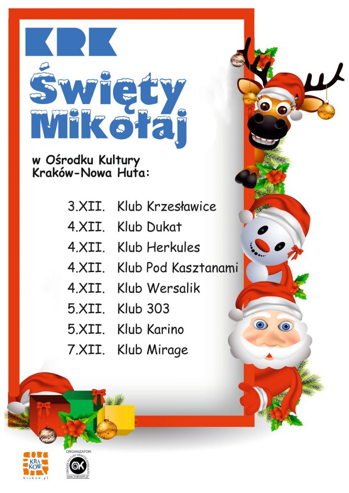 Na wizytę Œwiętego Mikołaja czekajš również w Klubach Oœrodka Kultury Kraków-Nowa Huta. Już 3 grudnia w Klubie Krzesławice dzieci i młodzież wspólnie poszukiwać będš œw. Mikołaja. Przeszkadzać im w tym będzie figlarny diabełek, który poprzestawia wszystkie drogowskazy, po to by Mikołaj nie mógł trafić na miejsce spotkania. Na szczęœcie dzieci będš mogły liczyć na pomoc aniołka, który weŸmie sprawy w swoje ręce. 4 grudnia odbędš się aż cztery spotkania ze œwiętym Mikołajem. W programie spotkania w Klubie Dukat przewidziano liczne zabawy i zadania, prezenty i mały poczęstunek. W Klubie Wersalik na dzieci w wieku 2-8 lat czekać będš zabawy ze Œnieżynkami i podarunki. Do wspólnego tropienia œladów Mikołaja zaprosi dzieci Klub Herkules. Œwięty odwiedzi także Klub Pod Kasztanami, w którym to dzieci dowiedzš się, jakie imię nosi Mikołaj w innych krajach. 5 grudnia Mikołaj zagoœci w Klubie Karino. Uczestnicy spotkania będš wspólnie ubierać choinkę własnoręcznie wykonanymi ozdobami z bibuły, orzechów i ciasta solnego, będš bawić się przy œwištecznym drzewku, a także poszukiwać Mikołaja i Œnieżynki oraz ukrytych prezentów. W tym samym dniu do Klubu 303 zawita zwariowana mikołajkowa œwita, która przygotuje wszystkich uczestników do spotkania ze swoim Szefem. Dzieci nauczš się okrzyków przywołujšcych Mikołaja, odtańczš Mikołajowy Taniec Zwariowaniec, przygotujš wspólny prezent i wreszcie przywołajš oczekiwanego Goœcia, który w swych magicznych saniach przywiezie dla wszystkich dzieci prezenty. Œwięty Mikołaj nie opuœci szybko Nowej Huty. 7 grudnia w Klubie Mirage odbędzie się spotkanie dla dzieci, które dowiedzš się co trzeba robić, żeby zostać pomocnikiem Œwiętego, a potem poczujš się jak elfy i razem z Mikołajem przygotujš prezenty dla innych maluchów. Na koniec wszystkie dzieci, które w pracowni Mikołaja były grzeczne i pracowite otrzymajš od niego podarunki.
