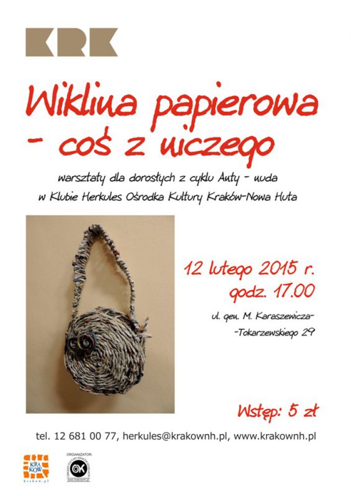 W ramach cyklu Anty-nuda Klub Herkules Oœrodka Kultury Kraków-Nowa Huta (ul. gen. M. Karaszewicza-Tokarzewskiego 29) zaprasza wszystkich, którzy chcš nabyć nowš umiejętnoœć, jakš jest wyplatanie przedmiotów z tzw. papierowej wikliny. Jeœli chcesz spróbować, ale nie wiesz jak się do tego zabrać, pokażemy Ci jak to zrobić. Tematem spotkania będš podkładki pod kubki, filiżanki, a także osłonki na kwiatki.