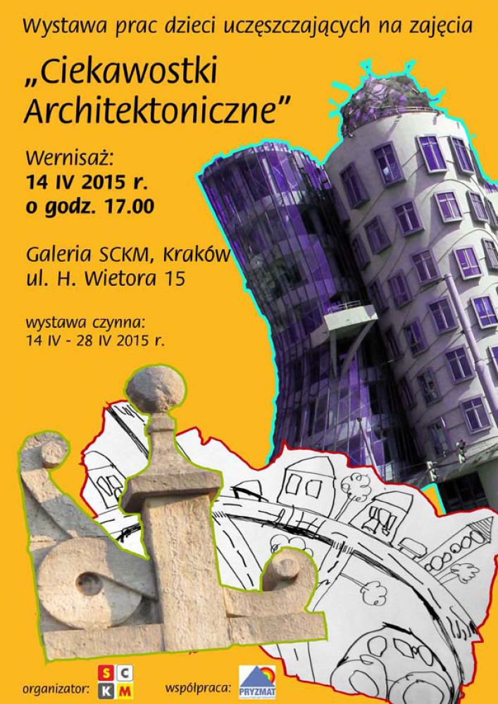 Zapraszamy rodziców, dzieci i młodzież na wernisaż wystawy „Ciekawostki Architektoniczne” . Wystawa prezentować będzie prace wykonane przez uczestników zajęć prowadzonych w Staromiejskim Centrum Kultury Młodzieży z zakresu architektury. Wernisaż odbędzie się 14.04.2015 o godzinie 17:00. w SCKM ul. Wietora 15