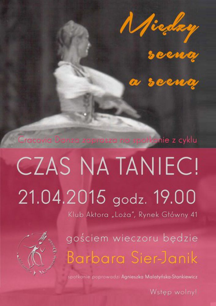 Barbara SIER-JANIK - tancerka i pedagog, przez wiele lat pierwsza solistka Baletu Teatru Wielkiego w Warszawie, wieloletnia nauczycielka tańca w warszawskiej Państwowej Szkole Baletowej, wykładowca tańca klasycznego i nowoczesnego w Akademii Muzycznej w Warszawie, a od 2007 roku wykładowca tańca klasycznego na Wydziale Teatru Tańca PWST w Krakowie, oddział w Bytomiu – będzie goœciem kolejnego spotkania z przygotowywanego przez Balet Dworski Cracovia Danza cyklu CZAS NA TANIEC!. Spotkanie zatytułowane Między scenš a scenš odbędzie się we wtorek, 21 kwietnia, o godz. 19, w Klubie Aktora „Loża”. Kraków, Rynek Główny 41.