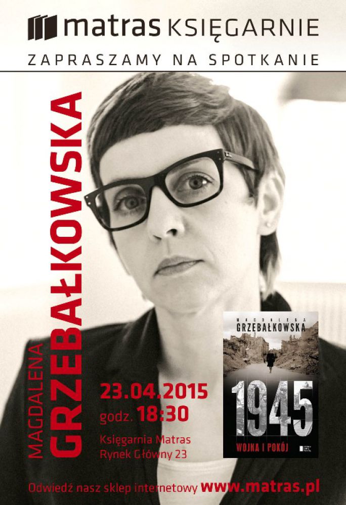 23 kwietnia sieć Matras zaprasza mieszkańców Krakowa do wspólnego więtowania wiatowego Dnia Ksišżki. W księgarni na Rynku Głównym odbędzie się spotkanie z Magdalenš Grzebałkowskš, autorkš reporterskiej powieci 1945. Wojna i pokój. Wydarzenie jest elementem obchodów wiatowego Dnia Ksišżki, które w księgarni Matras potrwa cały dzień.