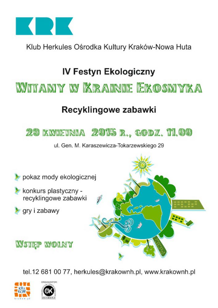 W œrodę 29 kwietnia zapraszamy na godz. 11.00 do Klubu Herkules Oœrodka Kultury Kraków-Nowa Huta (ul. gen. M. Karaszewicza-Tokarzewskiego 29), gdzie udamy się na wyprawę do Krainy Ekosmyka. Motywem przewodnim tegorocznej edycji Festynu Ekologicznego będš Recyklingowe zabawki. W programie wydarzenia między innymi: konkurs mody ekologicznej, konkurs plastyczny na wykonanie recyklingowych zabawek, mnóstwo zabawy i konkursów o tematyce ekologicznej.