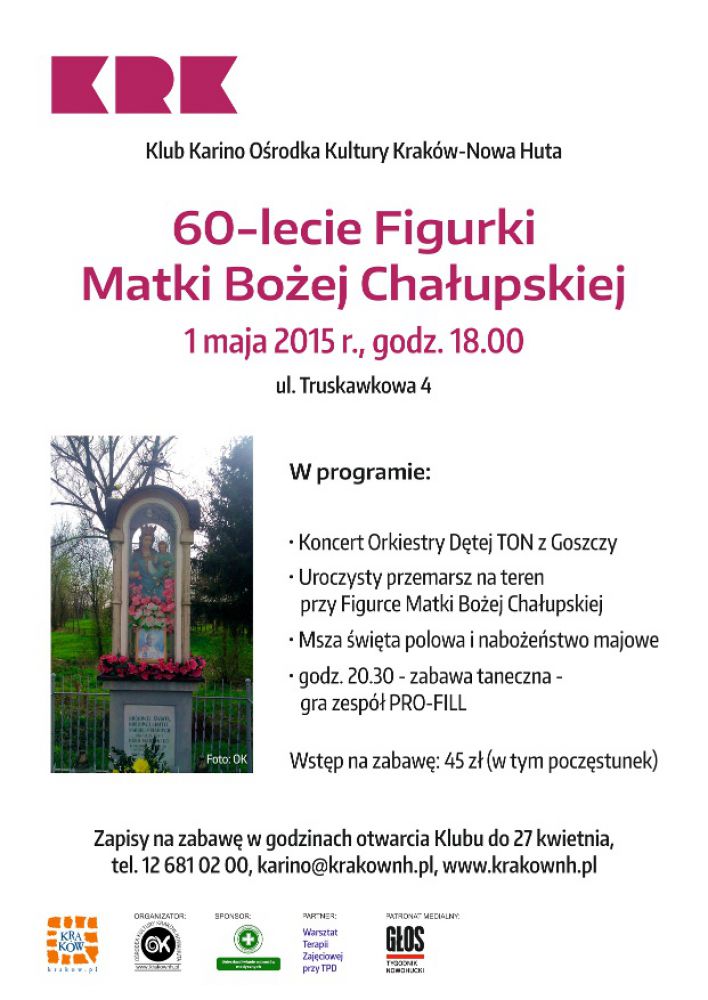 Klub Karino Oœrodka Kultury Kraków-Nowa Huta (ul. Truskawkowa 4) zaprasza na spotkanie majšce na celu uczczenie 60-lecia powstania kapliczki w osiedlu Chałupki. Kaplicę z figurš Matki Bożej ufundowali mieszkańcy osiedla Chałupki i nadal o niš dbajš i jš odnawiajš. Obecnie przy kapliczce powstał wydzielony pas zieleni, który pielęgnujš panie działajšce społecznie w Klubie Karino. Uroczystoœci obchodów 60-lecia powstania figurki odbędš się 1 maja br. i rozpocznš się o godz. 18.00 przy Klubie Karino. Orkiestra Dęta TON z Goszczy wykona koncert pieœni patriotycznych, następnie korowód uczestników uda się w kierunku figurki Matki Bożej Chałupskiej, przy której odbędzie się msza polowa i nabożeństwo majowe. Uroczystoœci zakończy zabawa taneczna w Klubie. Zapisy na zabawę tanecznš (tel. 12 681 02 00, karino@krakownh.pl).