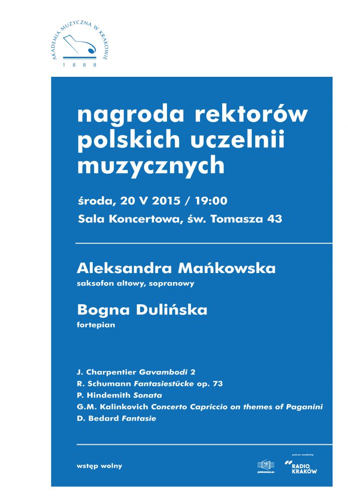 W rod 20 maja o godzinie 19:00 we wntrzu Sali koncertowej przy ul. w. Tomasza 43 zabrzmi muzyka saksofonowa. Wystpi duet z Akademii Muzycznej im. G.K. Bacewiczw w odzi: Aleksandra Makowska, grajca na saksofonie altowym i sopranowym oraz Bogna Duliska, towarzyszca na fortepianie. Zabrzmi kompozycje m.in. J. Charpentiera, R. Schumanna oraz P. Hindemitha. Wstp na koncert wolny.