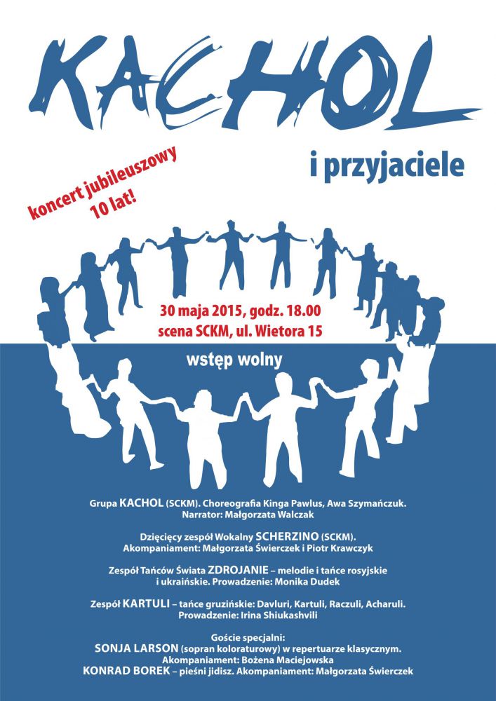 Zapraszamy na jubileusz grupy KACHOL, który odbędzie się 30.05.2015 o godzinie 18:00 w Staromiejskim Centrum Kultury Młodzieży w Krakowie. W programie występy zespołu dziecięco-wokalnego Scherzino, Tańców Œwiata Zdrojanie oraz zespołu Kartuli. Goœcmi specjalnym będš Sonja Garson (sporan koloraturowy) oraz Kon rad Borek – pieœni idisz. Wstęp wolny!!