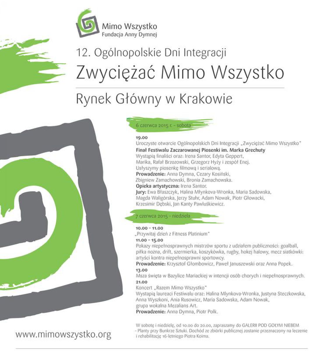 Fundacja Anny Dymnej Mimo Wszystko pragnie najcieplej jak to możliwe, zaprosić wszystkich (bez wyjštku!) na dwa magiczne, czerwcowe wieczory. Już 6 i 7 czerwca, na krakowskim Rynku Głównym odbędš się 12. Ogólnopolskie Dni Integracji Zwyciężać Mimo Wszystko, pełne atrakcji, więto osób niepełnosprawnych, w trakcie którego pokazywany jest Ich dorobek artystyczny i sportowy. Warto to zobaczyć i przeżyć by przekonać się, że talent czy pasja nie znajš ograniczeń, a niepełnosprawnoć nie stanowi żadnej bariery.