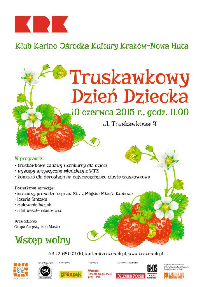 Klub Karino Oœrodka Kultury Kraków-Nowa Huta (ul. Truskawkowa 4) zaprasza 10 czerwca o godz. 11.00 na najsmaczniejszy i najzdrowszy festyn rodzinny w całym Krakowie! Jak co roku Klub Karino zapewnia moc atrakcji i zaprasza na wspólne œwiętowanie. Będš zabawy dla najmłodszych oraz bezpłatne wesołe miasteczko, a dla dorosłych konkurs kulinarny na najsmaczniejsze ciasto truskawkowe. W tym dniu królować będš TRUSKAWKI. Regulamin i karta zgłoszenia do pobrania na www.krakownh.pl.