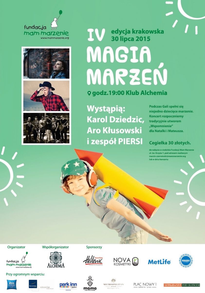 Już po raz czwarty - Ambasador Fundacji Mam Marzenie Małgorzata Kożuchowska oraz wolontariusze serdecznie zapraszajš wszystkich na koncert charytatywny „Magia Marzeń IV – edycja krakowska”, który odbędzie się 30 lipca 2015 roku o godzinie 19:00 w klubie Alchemia.