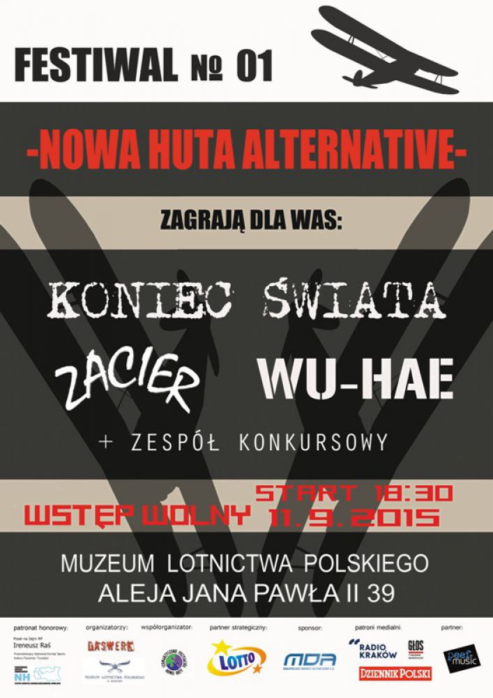 Cykl rozpocznie się 11 wrzenia o godz. 18.30 koncertem w Muzeum Lotnictwa Polskiego w Krakowie (al. Jana Pawła II 39). Na plenerowej scenie zagrajš nietuzinkowe zespoły muzyczne: Koniec wiata, WU-HAE i Zacier. To będzie mocne rockowo-alternatywne uderzenie. Wstęp na koncert jest bezpłatny. Celem Festiwalu Nowa Huta Alternative jest nie tylko zapełnienie niszy muzycznej, ale też promocja młodych twórców. Stšd też na każdym koncercie możliwoć zaistnienia będš miały kapele, które stawiajš pierwsze kroki na polskiej scenie muzycznej.
