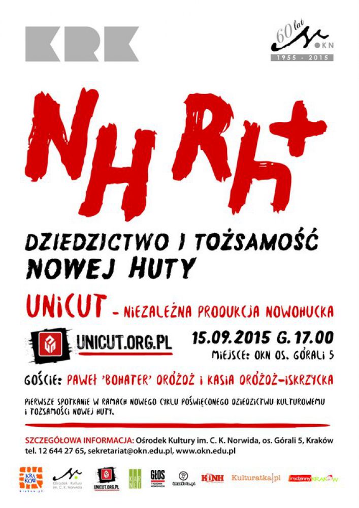 Pierwsze spotkanie w ramach nowego cyklu poœwięconego dziedzictwu kulturowemu i tożsamoœci Nowej Huty. Goœćmi będš Paweł ‘Bohater’ Dróżdż i Kasia Dróżdż-Iskrzycka – współzałożyciele UNICUT – Niezależna Produkcja Nowohucka.