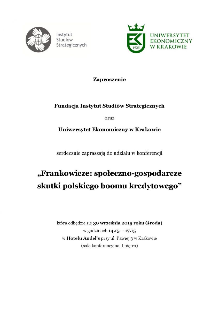 Fundacja Instytut Studiów Strategicznych oraz Uniwersytet Ekonomiczny w Krakowie serdecznie zapraszajš do udziału w konferencji Frankowicze: społeczno-gospodarcze skutki polskiego boomu kredytowego.